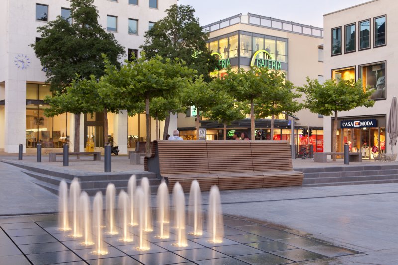 Objektdetails: Muschelkalkplatten edelgrau von TRACO in einer Neuinterpretation des Ruf’schen Rasters. Dazu beleuchtete Sitzelemente und Fontänen.