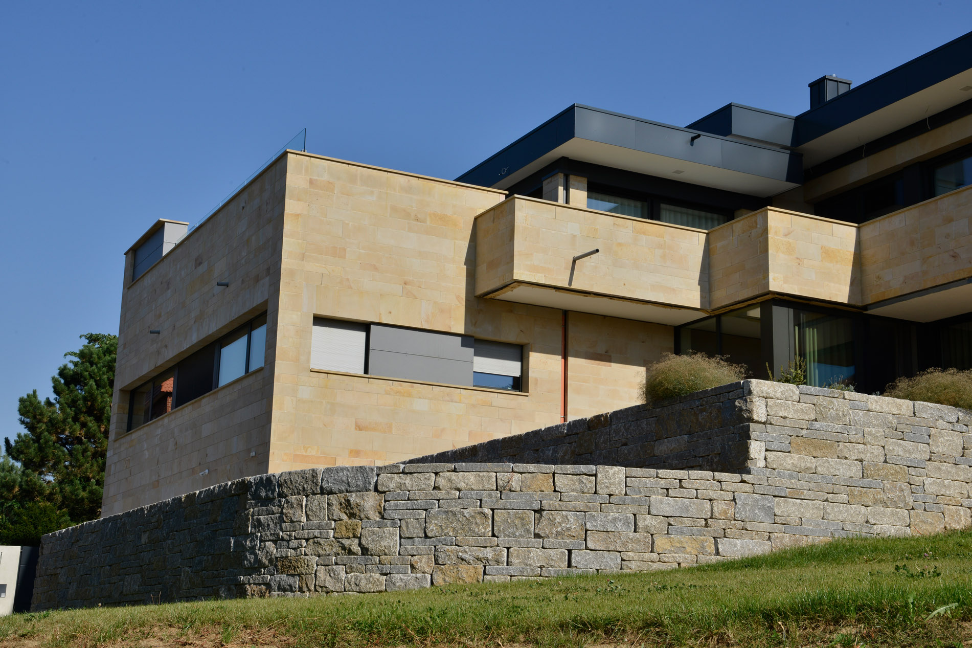 Villa Dr. Bohn Lübbecke Fassadenplatten Wandplatten Verblendung geschliffen C120 Seeberger Sandstein Mauerwerk Muschelkalk