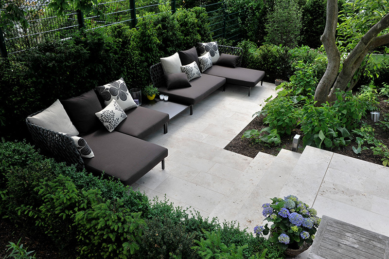 Villengarten mit Naturstein Blockstufen und Bodenplatten aus Bauhaus Travertin von TRACO